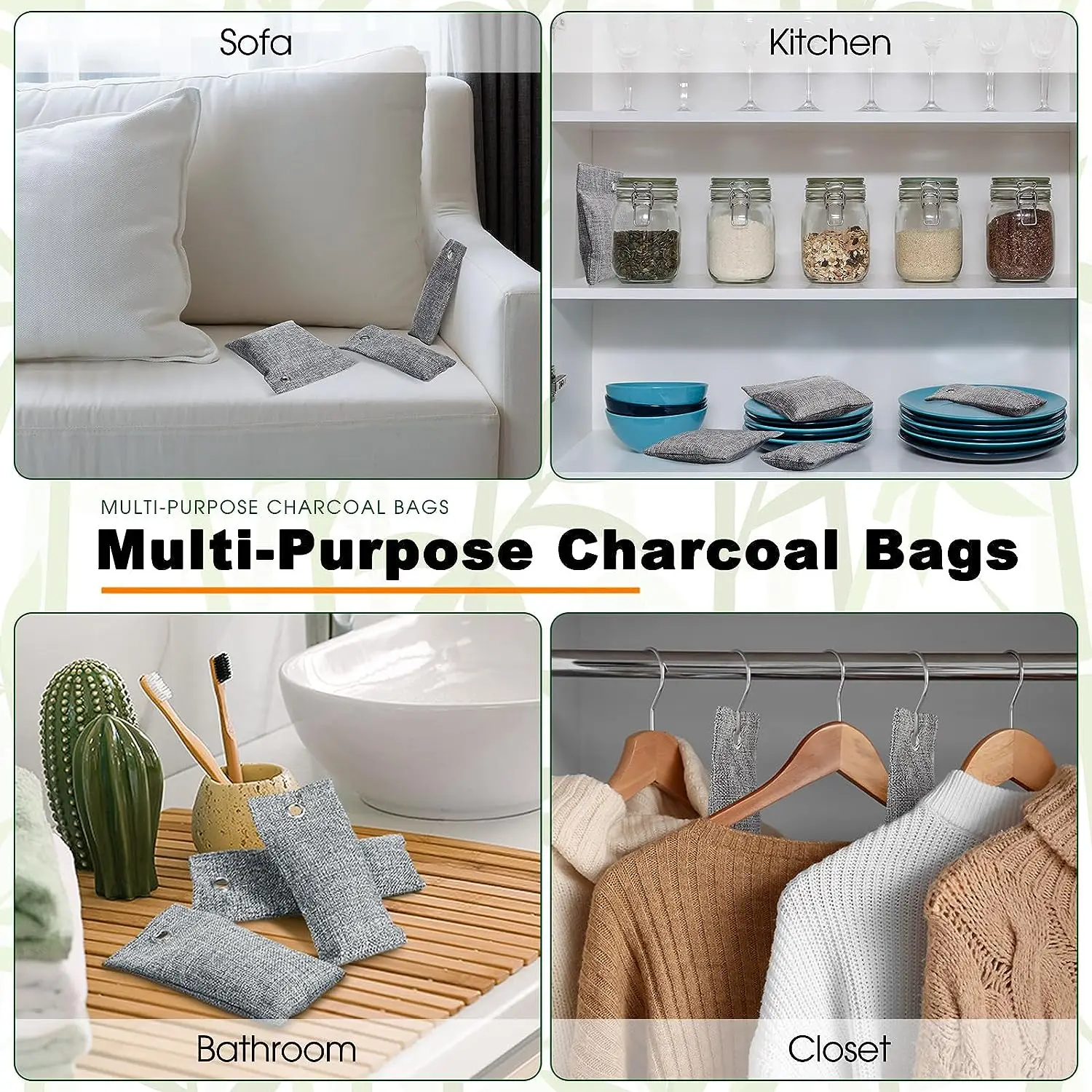 Activated bamboo charcoal absorbs odors from pets, shoes, smoke, bathrooms, cars, and more — leaving your space naturally fresh.